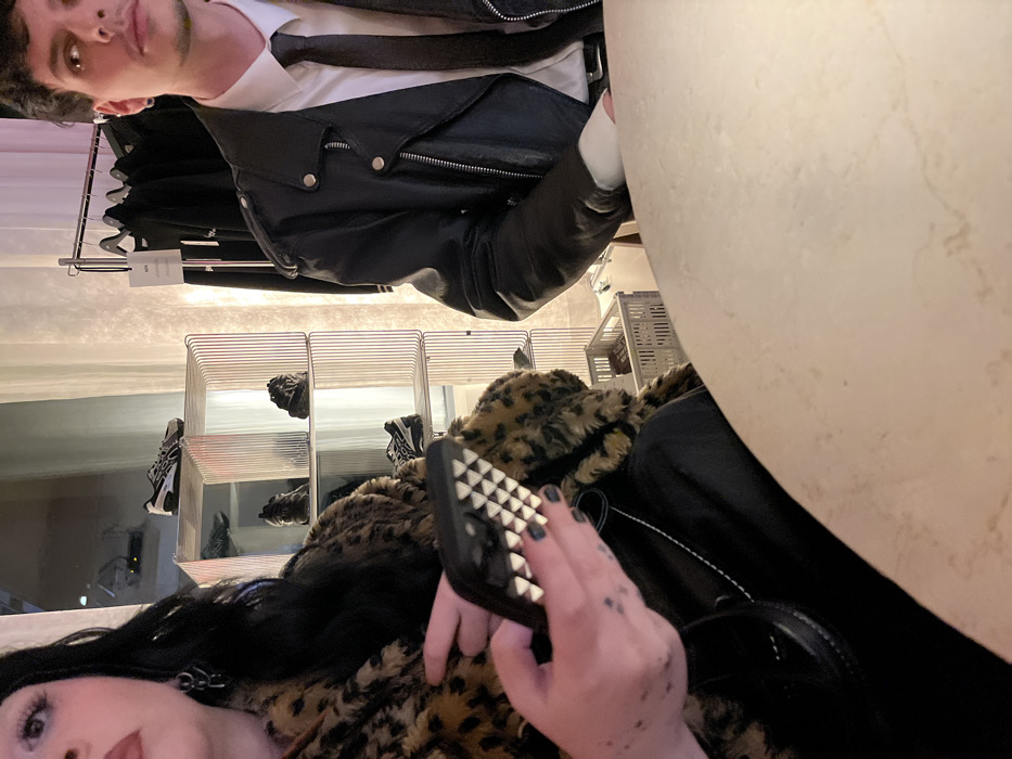 Two people stand near clothing racks, one wearing a black leather jacket, white shirt, and tie. The other wears a leopard print coat and holds a black studded phone case. A white marble-like object fills part of the frame. Reflected shelves with shoes are visible in the background.