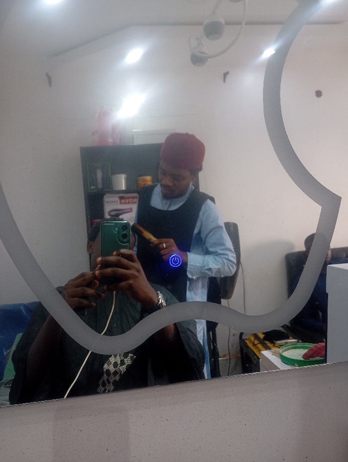 The image depicts a mirror reflection within a barbershop or hair salon located in the city of Bukuru, Nigeria