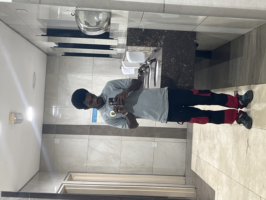 A male individual stands in a public restroom, located in Mile 11, Ghana, capturing a mirror selfie with a black smartphone
