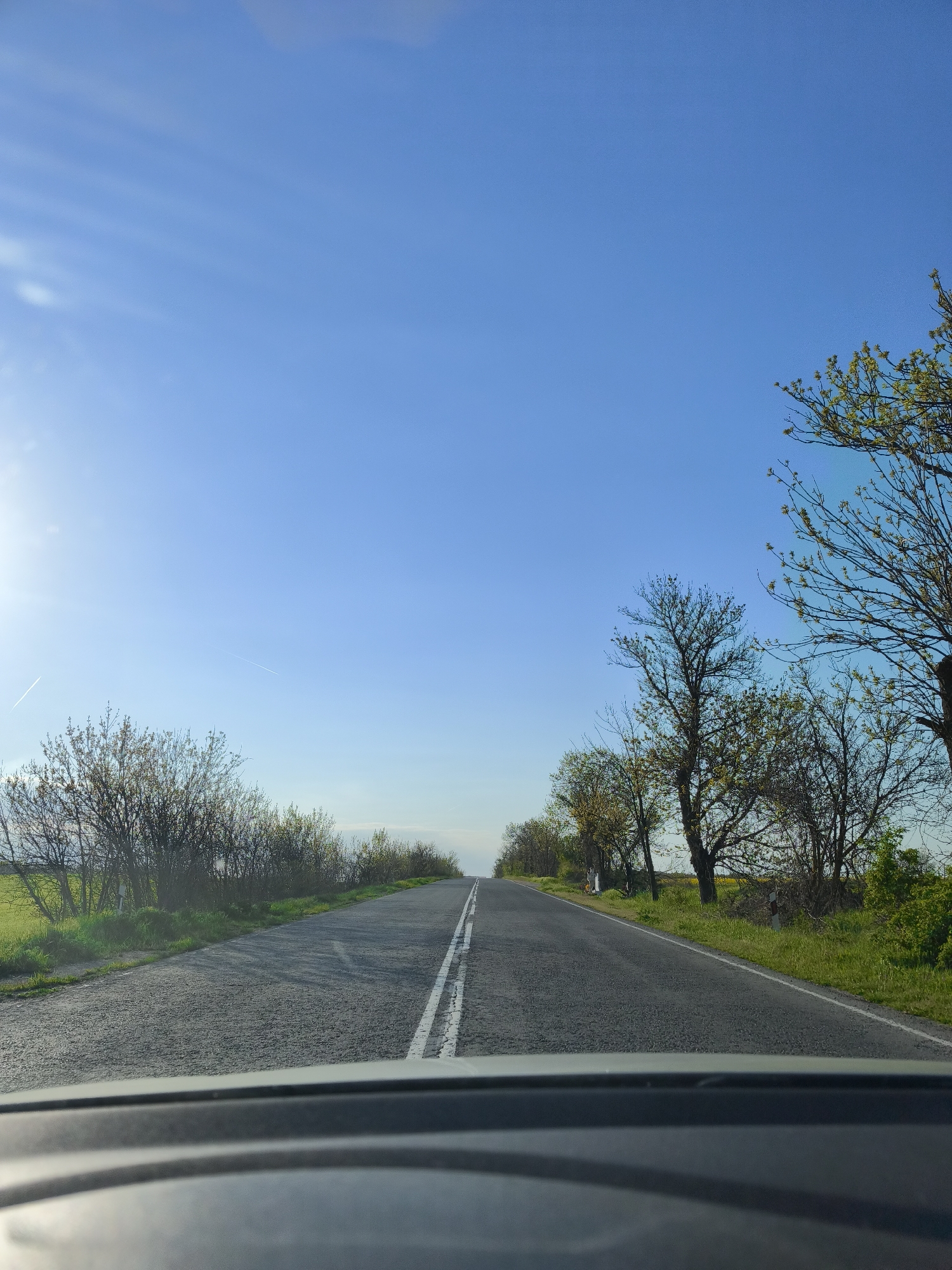 road in Byala, Bulgaria, looking straight ahead. The road is asphalt with a double white line down the center. The road has green grass and trees on both sides. The sky is blue and clear. The view is from inside a vehicle, showing part of the dashboard.