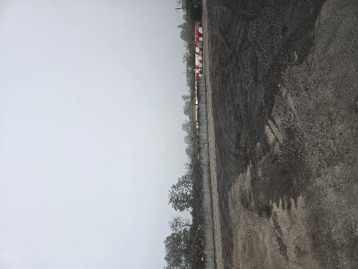 The image depicts an expansive, unoccupied outdoor lot under an overcast sky in Sessenheim, France. The foreground consists of a dark grey gravel and dirt surface, exhibiting multiple tire tracks and various darker, possibly damp, patches. In the midground, a low, light grey concrete or block wall extends horizontally across the frame. Behind this wall, a line of deciduous trees, mostly bare or sparse, is visible, with additional trees extending towards the horizon line, which is obscured by haze or fog. To the right, behind the wall and among the trees, stacks of red and white plastic barriers or containers are arranged. No individuals or active subjects are present.