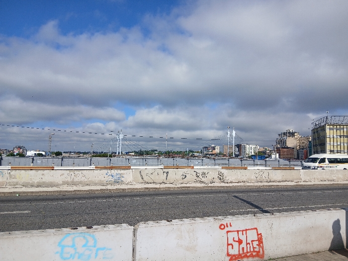 A cityscape is viewed over a highway with concrete dividers. Graffiti decorates the barriers. In the background, buildings rise with varying architectural styles. A suspension bridge spans the scene. The sky is a mix of blue and gray clouds. A white van drives along the highway. Utility poles stretch across the horizon.
