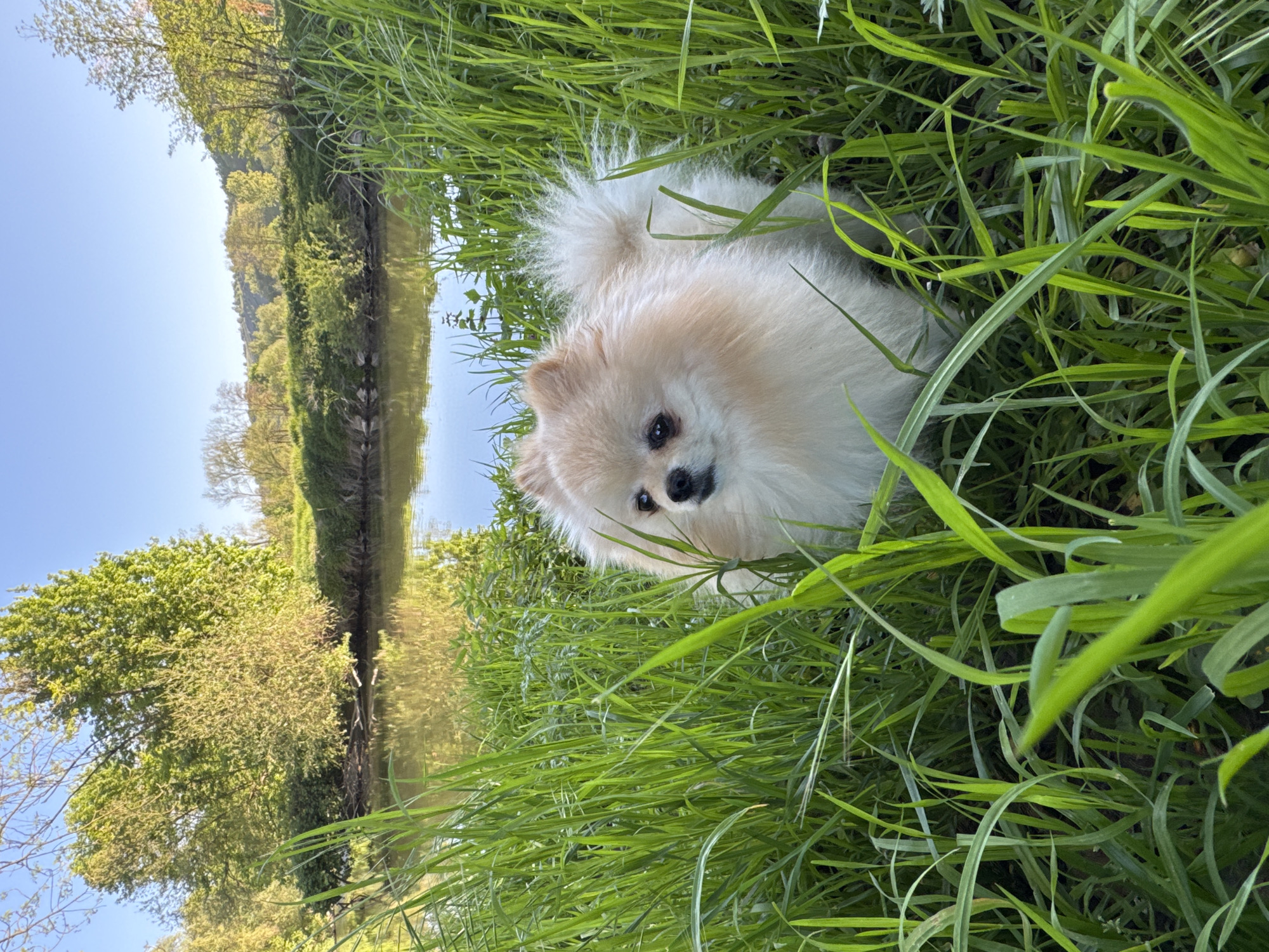 - "cream-colored Pomeranian dog sitting in long, green grass near a body of water" by FM-PafRp2, licensed under CC BY 4.0