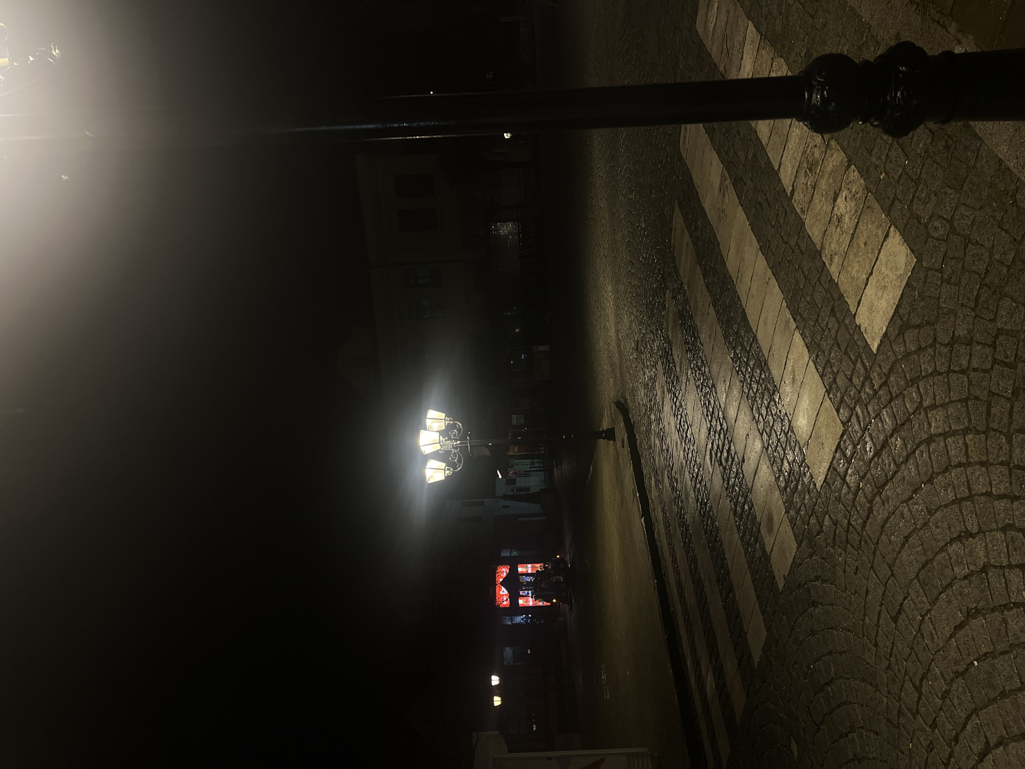 The image depicts a night scene in Tryavna, Bulgaria, featuring a cobblestone street illuminated by streetlights. A distinctive black lamppost dominates the foreground, its ornate base resting on a zebra-striped crosswalk. In the distance, buildings line the street, their facades dimly lit. A centrally located decorative streetlight stands out, with a red-lit building behind it. Further down the street, several other streetlights are visible, diminishing into the darkness. The ground appears wet, reflecting the ambient light.