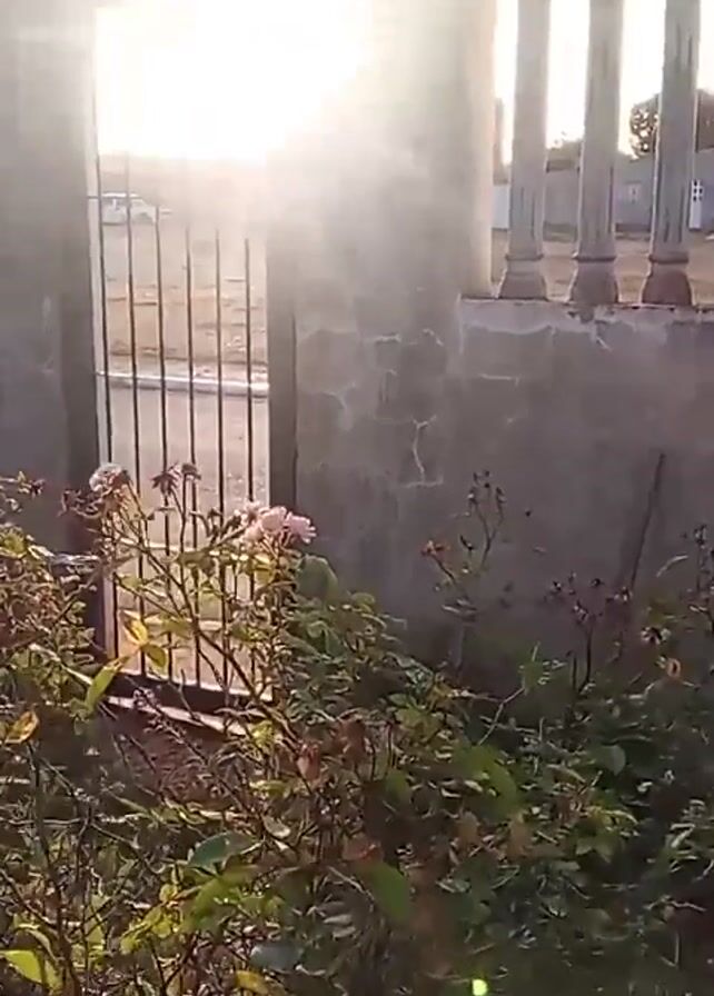 The video depicts a gated entrance, heavily backlit by the sun, causing a significant lens flare