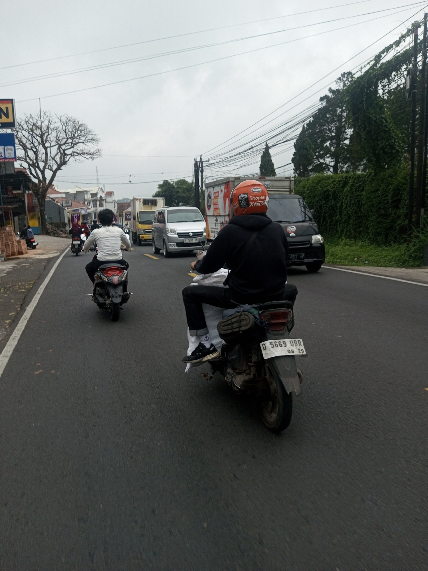 The scene is located in the city of Houaythat, Laos, depicting a multi-lane asphalt road under an overcast sky. In the foreground, a person rides a dark scooter, viewed from behind. The rider wears a black hooded sweatshirt, black pants, white socks, and black sneakers, with rolled items strapped to the rear seat. An orange helmet displaying "Shopee Xpress," "Plaaschoen," and other logos covers the rider's head. The scooter's license plate reads "D 5669 UBR" with "09-29" below it. Ahead and to the left, another person on a red and black scooter, wearing a white long-sleeved shirt and black pants, travels in the same direction. On the opposite side of the road, traffic includes a white van with an "F" series license plate, a yellow truck, a large white box truck, and a black van with a "8927 HP" license plate. To the left of the road, a dirt shoulder holds a pile of red bricks beside commercial buildings, one partially displaying "ROTI U." A bare deciduous tree stands among these structures. The right side of the road features a dense green hedge, behind which are several trees and multiple utility poles laden with numerous crisscrossing electrical wires that extend across the upper frame.
