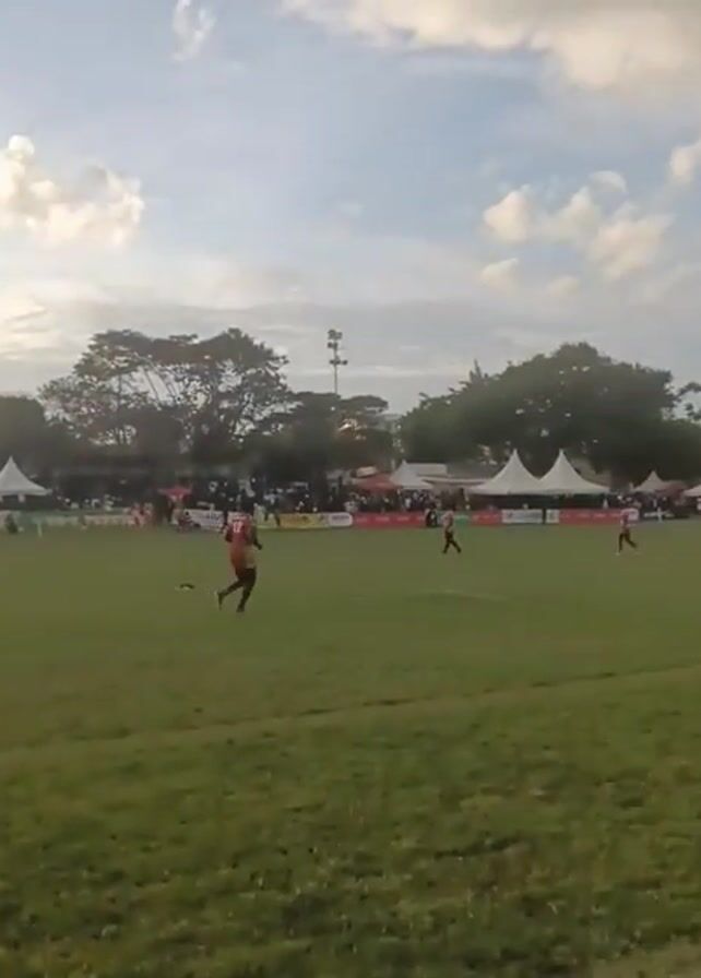 group of men playing a game on a grassy field. They are wearing matching jerseys and running around with a ball. In the background, there are tents, trees, people, and a large screen displaying the game. There are also light posts illuminating the field. The sky is cloudy and the weather appears pleasant.