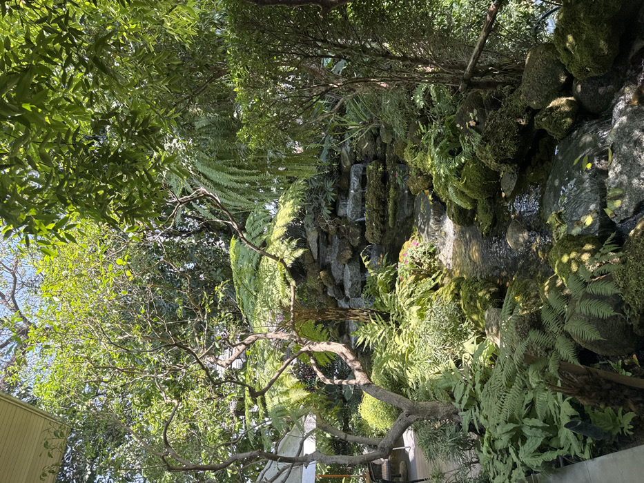 This image depicts a lush, verdant outdoor garden scene located in Nong Pa Khrang, Thailand. The scene is devoid of human presence. A prominent multi-tiered artificial waterfall, constructed from grey stones heavily covered in green moss, is situated in the central-right. Water cascades over multiple small drops, forming a winding stream that flows towards the foreground. The stream bed is comprised of various rocks, many also covered in moss, with reflections of dappled sunlight on the water's surface. Dense vegetation dominates the environment. Numerous trees, shrubs, and ferns are present, displaying various shades of green foliage. A large tree fern with broad fronds is centrally positioned near the waterfall. Taller trees with visible trunks and branches extend towards the top of the frame, through which patches of clear blue sky are visible. Sunlight filters through the canopy, creating distinct patterns of illumination and shadow on the plants and rocks. On the far left, a light-colored paved surface or deck is visible, along with parts of a white patio umbrella and a dark chair or table leg, indicating an adjacent outdoor seating area. Above this area, a white ceiling or overhang structure is present. On the far right, a rustic fence or railing made from rough-hewn wooden branches extends vertically. No actions or interactions are observable.