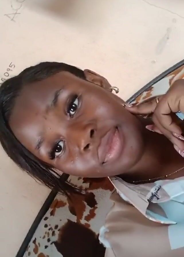 A close-up shot shows a dark-skinned woman with dark hair pulled back from her face. She is wearing a light-colored patterned shirt, a thin gold necklace, gold hoop earrings, and a black watch with a gold face. Her nails are long and decorated. The woman is touching her face near her ear with her right hand. The background is a wall with writing on it and a patterned surface. Music is playing in the background.