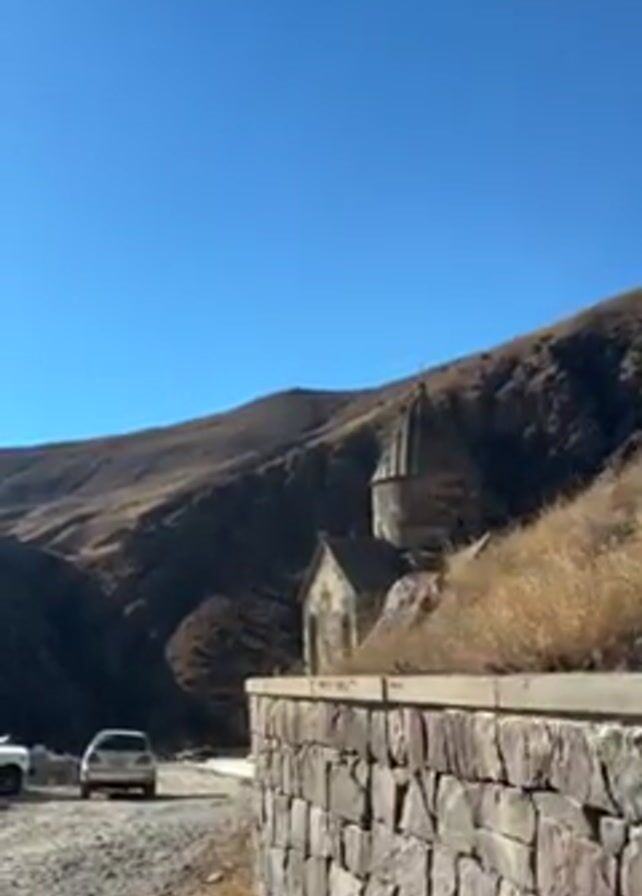The video captures a stone church perched on a hillside against a clear blue sky. The church has a central tower and is surrounded by dry, golden grass. A stone wall runs along the base of the hill, with a dirt road and a couple of parked cars in front of it. The landscape is mountainous, with brown hills rising in the background.