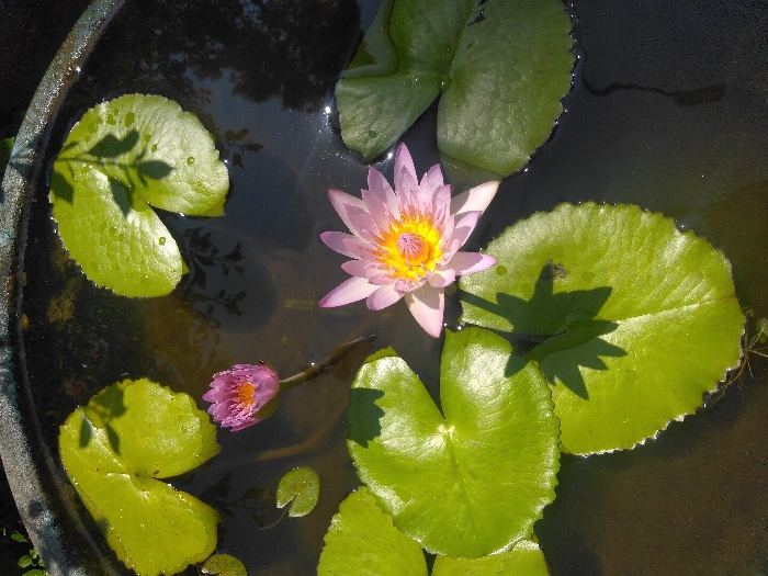 The image, captured in the city of Siquisique, Venezuela, depicts an elevated view of an aquatic plant arrangement within a dark, circular container. Two water lilies and multiple lily pads float on the dark, reflective water surface. One water lily, positioned towards the lower-center, is fully open, displaying light pink to purple petals surrounding a bright yellow center. A second water lily, located towards the upper-left, is a closed or partially opened bud with darker pink or magenta petals. Several round, vibrant green lily pads of varying sizes are distributed across the water. Shadows of external foliage and the water lilies themselves are cast onto the water and certain lily pads; for instance, a distinct dendritic shadow pattern is visible on an upper-right lily pad, and a flower's shadow is cast upon a lower-center pad. Faint reflections of distant trees or structures are discernible in the water's surface. The dark, textured rim of the containing vessel is visible along the top and upper-left edges. A small, dark, oblong object, consistent with an insect, is present on the lower-center lily pad. The scene is brightly illuminated by direct overhead sunlight.