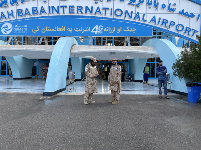 The image displays the exterior of Ahmad Shah Baba International Airport in Unknown, Afghanistan