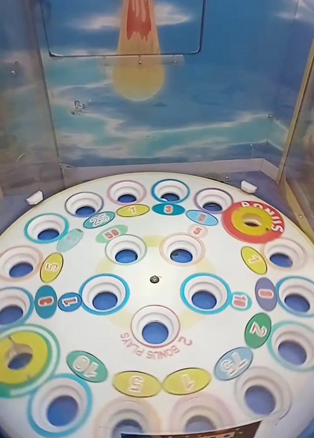 inside of an arcade-style game. The camera is positioned above a rotating circular board with various numbered slots (1, 2, 5, 10, 25, 50, 75, plus "2 Bonus Plays" and a "Bonus") and holes in them. Balls are dropping onto the board and falling into the holes. The game is inside a cabinet with a blue sky and clouds painted on one side, and a launching mechanism on the other. The game is in motion, and balls are actively moving around the circular board.