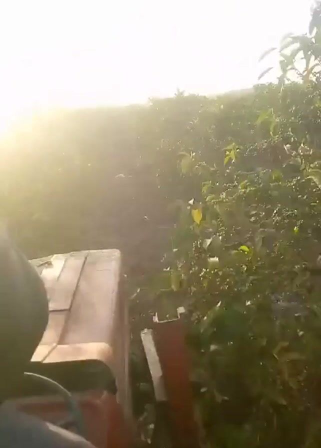 point of view from someone driving a small, orange tractor through a field of small green trees or bushes. The sun is shining brightly, causing a glare. The soil appears muddy, with some standing water. The person driving is wearing a dark hoodie. The tractor moves steadily through the field, passing close to the vegetation.