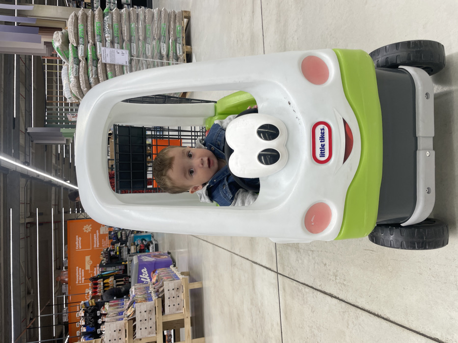 A young child, approximately a toddler, with light brown hair, is seated in a white and lime-green Little Tikes Cozy Coupe toy car, facing directly towards the camera