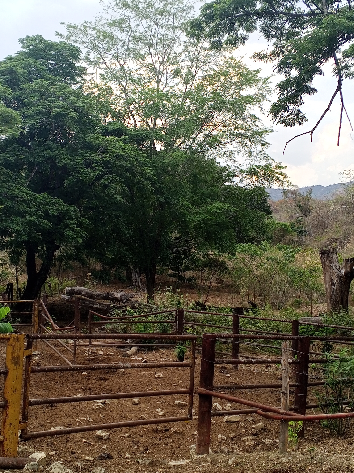 The image depicts a rural scene in Los Leoncitos, Venezuela. A roughly constructed, aged metal fence encloses a plot of bare earth scattered with stones. The fence's rusty appearance suggests significant weathering. Beyond the fence lies dense vegetation, including trees of varying sizes and shrubbery. A fallen log rests behind the fence. In the distance, rolling hills are visible against a muted sky. No people are present in the image.