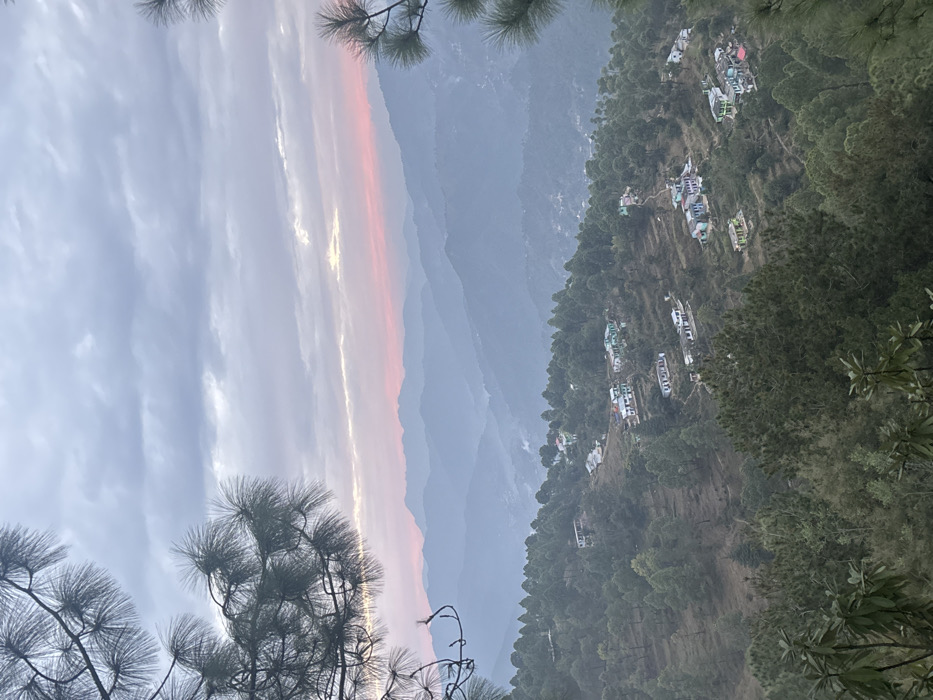 - "The image depicts a panoramic view of a mountainous landscape in Kasar Devi, India, under an overcast sky displaying hues of pink and orange near the horizon" by FM-qdUeY2, licensed under CC BY 4.0