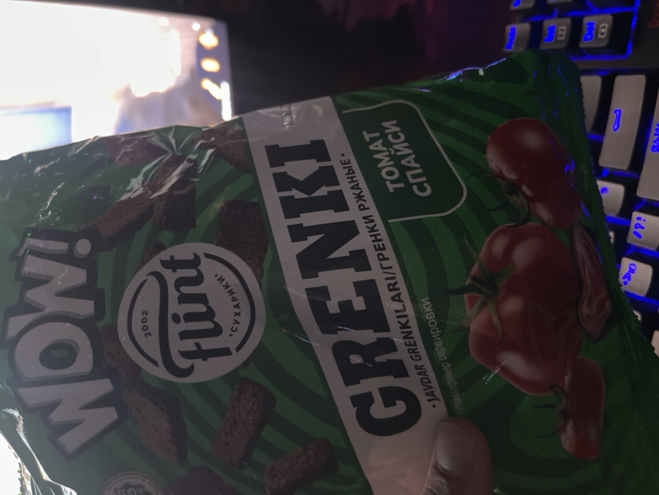 The scene, set indoors in Karmana, Uzbekistan, captures a close-up, angled view of a green and white "Flint" brand snack package. The package prominently displays "WOW!" at the top, followed by the brand "Flint" with "2002" and "СУХАРИКИ" (croutons) in a white oval logo. The product name "GRENKI" (croutons) is in large lettering, with "JAVDAR GRENKILARI/ГРЕНКИ РЖАНЫЕ" (Rye Grenki) below it. A green rectangular label on the right indicates the flavor "ТОМАТ СПАЙСИ" (Tomato Spicy). Illustrations of dark brown croutons and three red tomatoes with some reddish flakes are visible on the package. A human thumb and a portion of an index finger, displaying light to medium skin tone, are positioned on the lower-left, holding the snack bag. Beneath the package and to the right, a black mechanical keyboard with blue backlighting on its keys is partially visible. The background is blurred, showing indistinct bright light sources, suggesting a screen or window in an otherwise dimly lit interior.