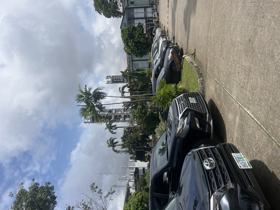 The image displays an outdoor parking area on a partly cloudy day in Lagos, Nigeria