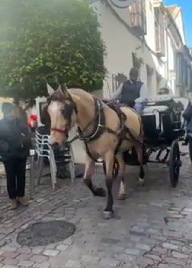 horse-drawn carriage moving along a cobblestone street. The horse is light brown with a black mane and tail. The carriage is black with white accents and has a driver and passengers. People are standing on the sidewalk, watching the carriage pass. There are buildings with white walls and green trees in the background. The day is sunny and the sky is blue.