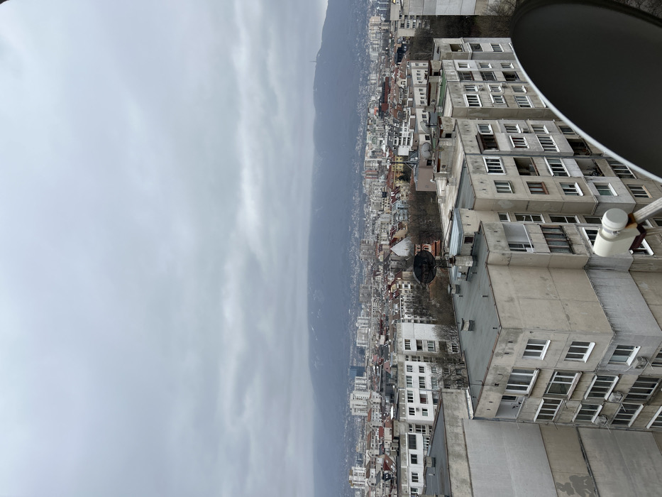 An elevated, wide-angle view depicts a dense urban landscape in Sofia, Bulgaria, set against a mountainous background under an overcast sky. In the foreground, the curved edge of a grey satellite dish with a white Low-Noise Block (LNB) is partially visible in the lower right quadrant. To the left and below, the concrete facade of a multi-story residential building features multiple white-framed windows and balconies. The midground is dominated by a sprawling array of multi-story residential buildings, primarily constructed from grey concrete in a block-style architectural pattern. These structures exhibit numerous rectangular windows, a mix of open and enclosed balconies, and externally mounted air conditioning units. Flat, dark rooftops are visible, some featuring ventilation systems, chimneys, and smaller satellite dishes. A prominent black, circular satellite dish is centrally positioned on the roof of a midground building. Bare deciduous trees are interspersed throughout the urban fabric. In the background, the cityscape gradually transitions into the foothills of a large mountain range, identifiable as Vitosha Mountain, a prominent landmark of Sofia. The mountain's slopes are dark grey-green with scattered patches of white snow on higher elevations. The upper sections of Vitosha Mountain are obscured by a thick layer of low-hanging grey clouds or fog. A slender transmission tower is visible on a distant peak to the right. The sky overhead is uniformly overcast and grey, indicating heavy cloud cover and diffused light conditions. No human figures or specific interactions are visible within the frame. The overall environment presents a densely developed urban area adjacent to mountainous terrain, under cool and cloudy weather conditions.