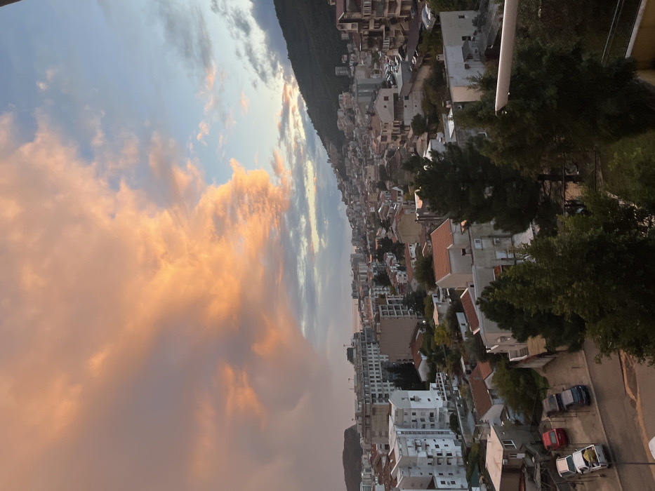 An elevated panoramic view captures the city of Budva, Montenegro, under a dramatically lit sky. The upper left and central sky are dominated by large cumulus clouds, intensely illuminated with warm orange and pink hues, indicative of either sunrise or sunset. The sky transitions to lighter blues and grays towards the right and horizon. The city of Budva occupies the midground, characterized by a dense arrangement of residential and commercial buildings extending from the coastline up a sloping terrain towards a verdant, dark green hillside on the right. Building facades exhibit a mix of light colors, primarily white and beige, with a blend of flat and red-tiled roofs. Taller, multi-story structures are visible closer to the coast in the mid-left, while smaller, older buildings are interspersed throughout. Streets with parked vehicles, including white, red, and dark-colored cars, are discernible in the lower-left quadrant. Green deciduous and coniferous trees are scattered among the buildings and form a denser canopy on the distant hillside and in the immediate foreground. In the far distance, a calm body of water, consistent with the Adriatic Sea, is visible beyond the urban sprawl. A distinct, rounded landmass or island is present on the far-left horizon. A beige horizontal architectural element, likely a balcony railing, is partially visible in the bottom right corner, indicating the elevated vantage point of the photographer. No individuals or specific actions are observed within the frame. The scene is static.
