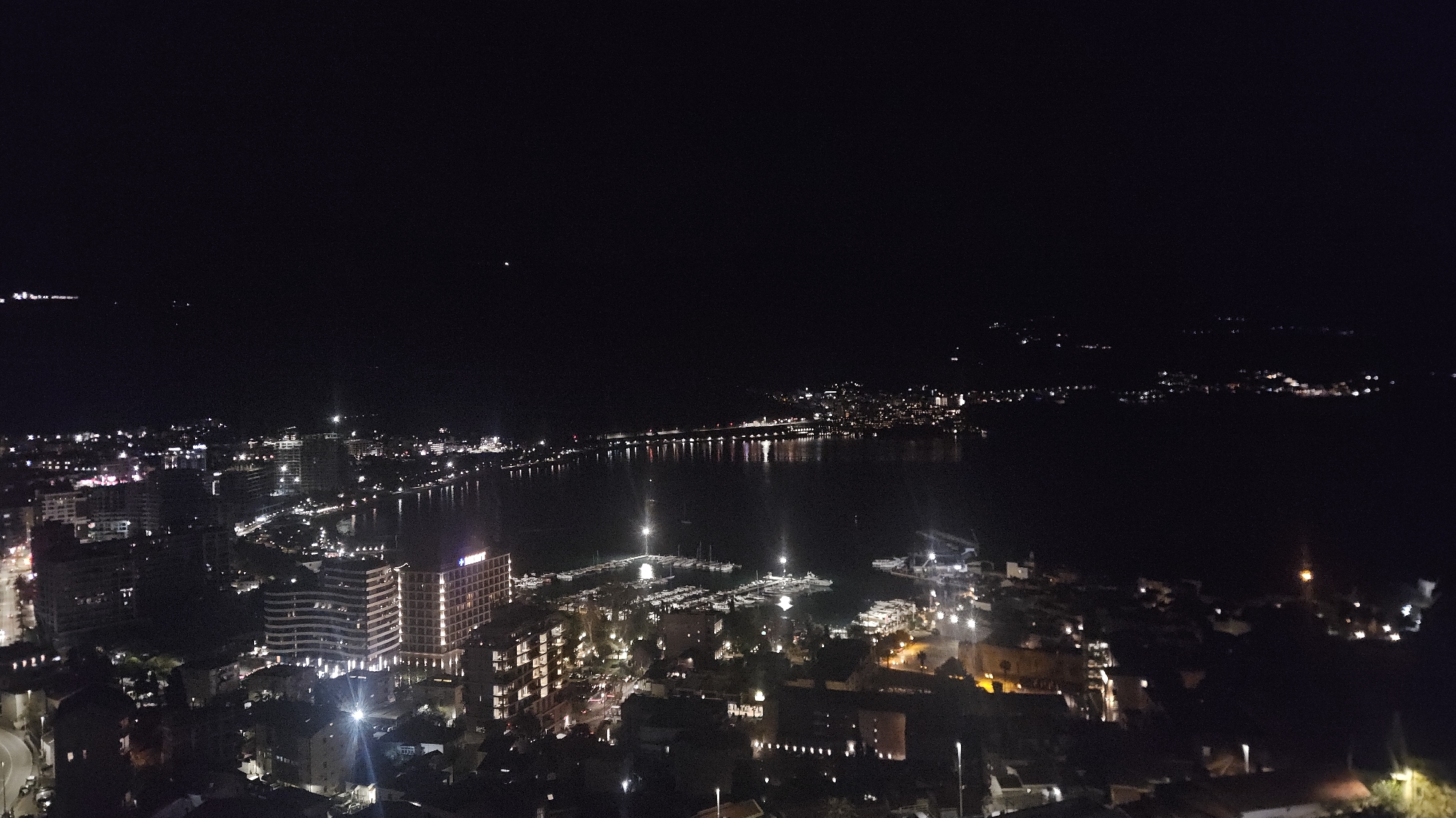 The image depicts a nighttime view of the city of Budva, Montenegro, from an elevated perspective