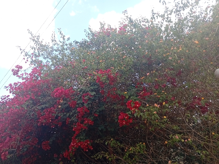 The scene depicts a dense mass of vegetation under a bright sky with scattered clouds in Ithemboni, Kenya. The foreground and midground are dominated by an extensive entanglement of flowering plants. Vibrant red bougainvillea blossoms are prominent, covering a significant portion of the frame, intertwined with green foliage. Clusters of smaller flowers, appearing yellow, light orange, and pinkish, are interspersed throughout the greenery, consistent with Lantana camara. In the upper left quadrant, two thin, dark utility lines are visible diagonally against the light blue sky. A partial view of a spherical, light-colored object, possibly a lamp or decorative element, is visible along the far right edge of the frame. No individuals, animals, or specific actions are present.