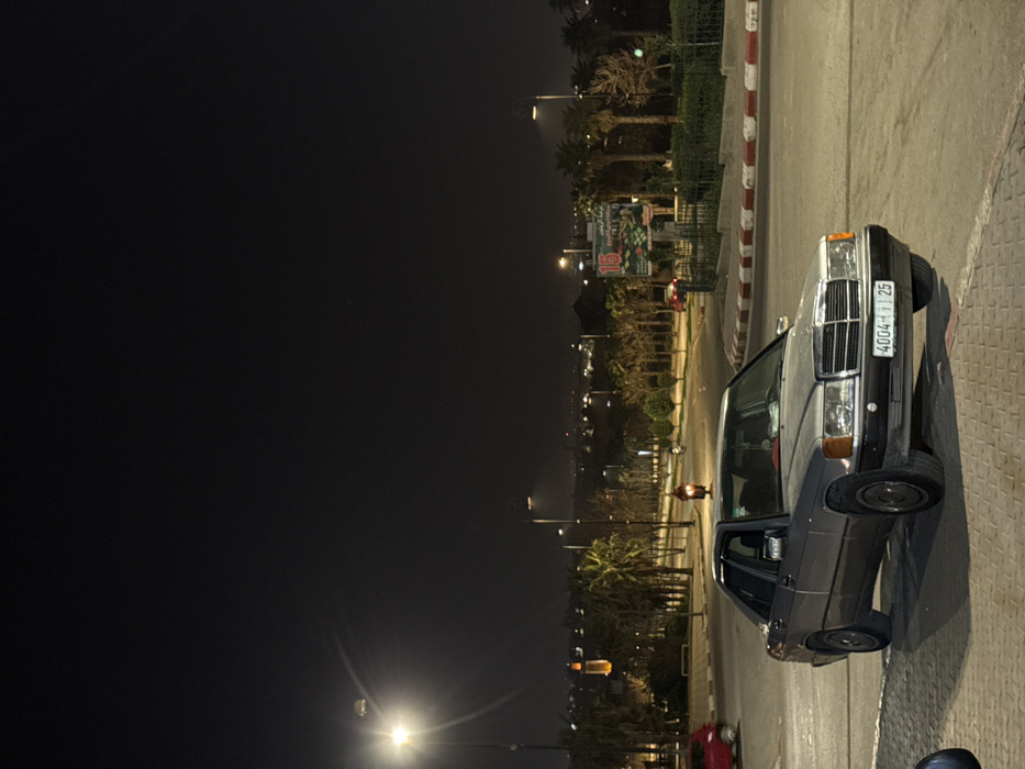 The image depicts a night-time urban street scene in Fez, Morocco. A silver-grey Mercedes-Benz W201 sedan is the primary subject, positioned in the foreground on the right side of a paved road, facing slightly left towards the viewer. Its Moroccan license plate, "4004 | 1 | 25," is clearly visible on the front bumper. The immediate road surface is light-colored pavement, bordered by a curb painted with red and white stripes to the right. In the mid-ground, a solitary individual is riding a motorcycle or scooter, moving away from the viewer, illuminated by overhead streetlights. A light-colored vehicle, possibly red, is partially visible in motion further left in the mid-ground. The background reveals a wide, tree-lined boulevard featuring numerous palm trees and other deciduous trees. Multiple streetlights illuminate the road and surrounding areas. To the far left in the background, a tall, light-colored structure resembling a minaret, with its top portion illuminated, stands against the dark night sky. On the far right background, a large billboard with "15" and Arabic text is partially visible. The sky is uniformly dark, indicating a late hour.