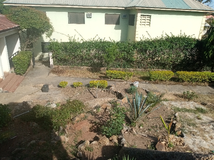The image depicts an outdoor scene within a compound in Jos, Nigeria, under clear daylight conditions. The foreground and midground feature a multi-tiered garden area composed primarily of reddish-brown soil, punctuated by various small green bushes, some arranged in a row of three low yellow-green shrubs. A larger succulent plant with rigid, pointed leaves stands prominently in the midground-left. Rocks delineate some of the garden's edges. A concrete pathway, showing signs of wear and cracking, traverses the midground horizontally. From the far left, a separate concrete path with wooden steps descends, connecting to a partial structure with a reddish-brown roof. On the horizontal path, a dark, rectangular object rests. A crumpled white plastic item is visible amidst the garden foliage near the center. In the background, a two-story building painted light green dominates the upper half of the image. It features a light-colored, possibly corrugated hip roof. Multiple rectangular windows with dark panes are visible, and at least two external air conditioning units are mounted on the upper facade. A dense, trimmed green hedge, approximately chest-height, runs horizontally along the base of this building, separating it from the garden area. No individuals or active interactions are present in the frame. The strong sunlight casts distinct shadows, indicating a bright, clear environment.