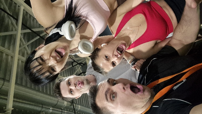 Five individuals contort their faces in a playful downward shot. A woman with black hair and glasses, wearing headphones, sticks her tongue out. Beside her, a woman in a pink tank top joins in the silliness. A third woman, clad in red athletic wear, opens her mouth wide. Two men complete the group; one makes a silly face with his tongue out while the other, wearing a black shirt with an orange stripe, opens his mouth in mock surprise. They appear to be posing in what seems to be an industrial or gym setting with a structural ceiling visible in the background.