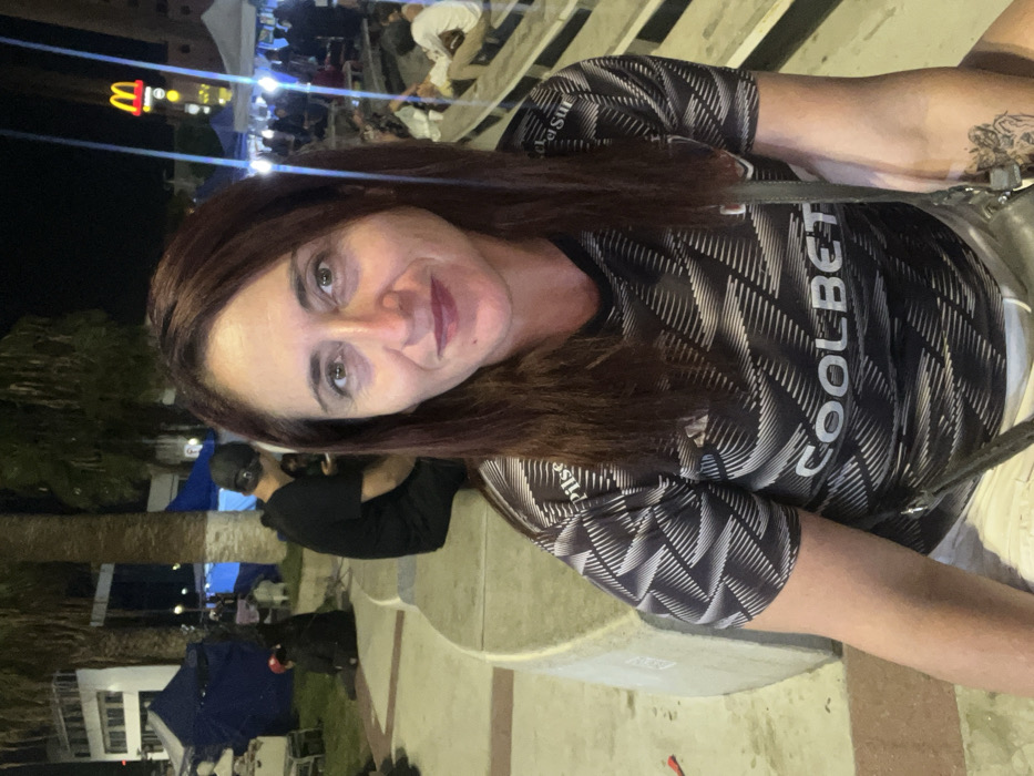 A woman with reddish-brown hair and fair skin poses for a photo, wearing a black and white patterned soccer jersey with "COOLBET" visible on the side. She is sitting on a light-colored concrete structure, potentially a bench or wall, in an outdoor setting. The background shows a nighttime scene with people, tents, and a McDonald's sign. Palm trees and streetlights are also visible in the background.