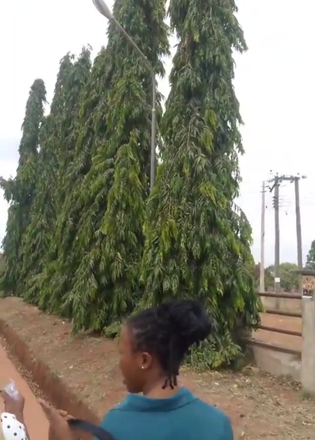 A woman with braided hair in a bun and a turquoise shirt walks on a sidewalk. She is facing away from the camera. To her left is a woman with a polka-dotted shirt. To their right is a row of tall, green, columnar trees. Behind the trees is a light pole and a building in the distance. Beyond that are telephone poles. The sky is overcast.