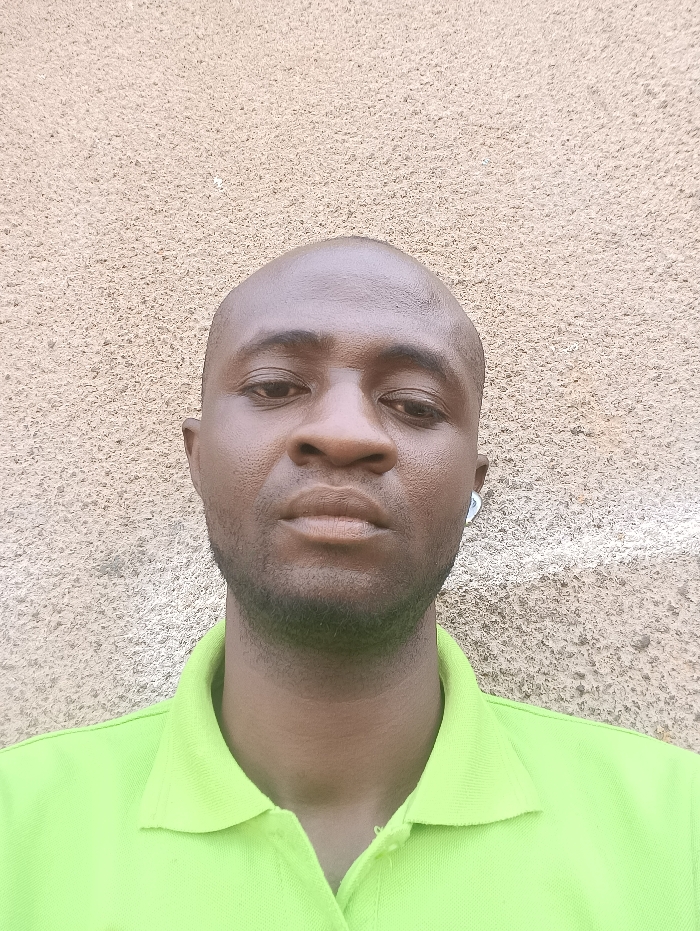 A close-up shot features a dark-skinned man with a shaved head and a short, dark beard. He wears a bright green polo shirt. The background is a textured, light brown or beige wall. The man looks directly at the camera with a neutral expression. A white earbud is visible in his right ear. The lighting is soft and diffused, highlighting the texture of the wall and the man's skin.
