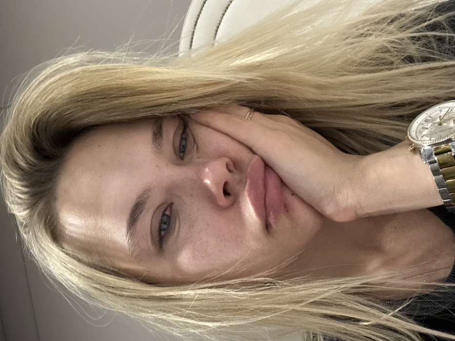 A young woman with fair skin, blonde hair, and blue eyes poses. Her face, tilted to the side, rests on her hand, showcasing a watch on her wrist. She wears a ring and is positioned indoors against a backdrop of a white, textured headboard. Her lips are slightly puckered.