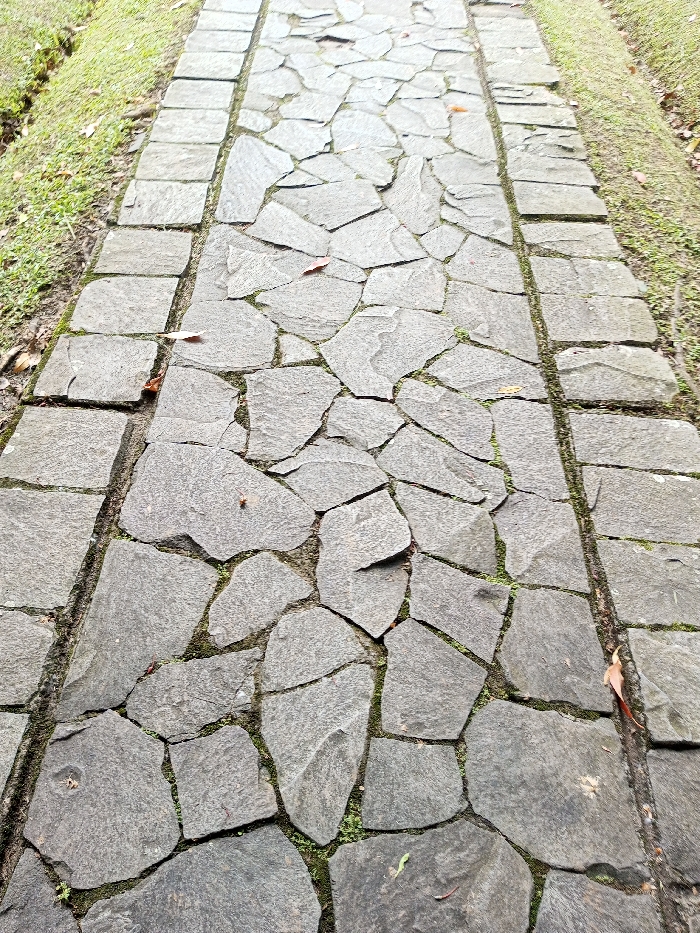 A stone pathway is framed by rectangular blocks on either side, bordering grass