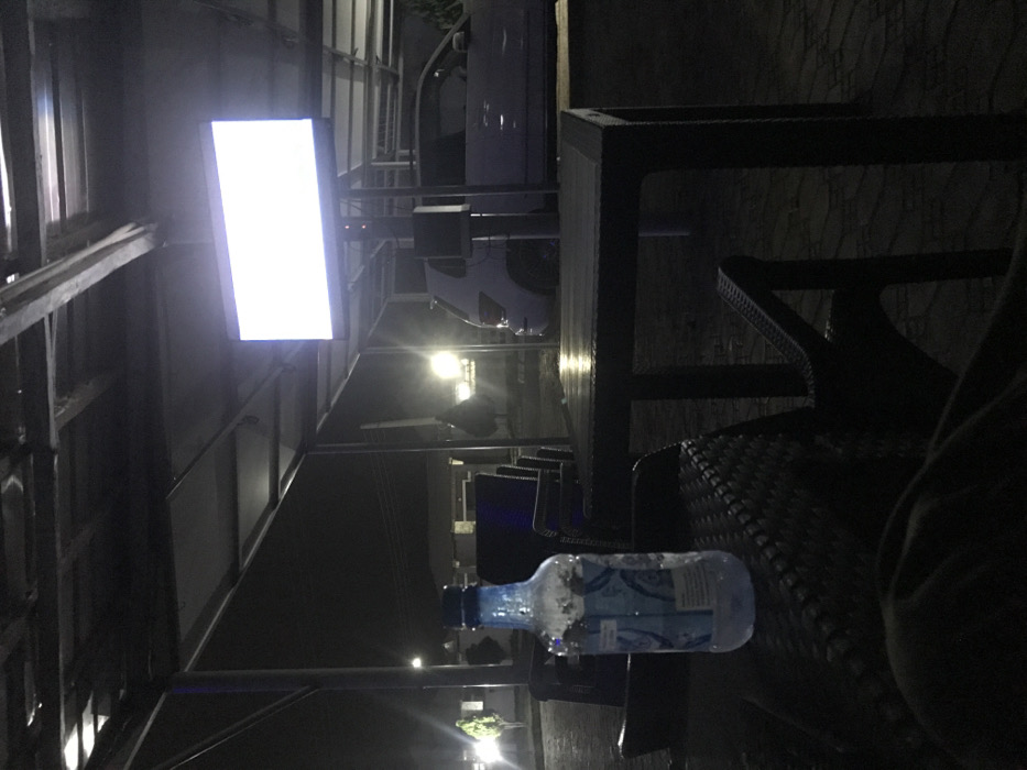 The image depicts a nighttime scene within a partially sheltered outdoor commercial or leisure establishment in Unknown, Nigeria. In the immediate foreground, a translucent plastic bottle with a blue cap and a visible label, displaying condensation, rests upright on the dark, woven surface of a chair. Below the bottle, a section of a person's leg or lap, clad in dark fabric, is visible, indicating the presence of an unseen individual occupying the chair from which the photograph was taken. To the right of this foreground chair, a dark, rectangular table with thick legs stands prominently. Further into the scene, an arrangement of additional dark-colored chairs is visible. Dominating the mid-ground and background is a large, brightly illuminated rectangular screen, likely a television or digital display, mounted on a dark pole structure and displaying an entirely white image. To the right of this screen, a light-colored SUV, possibly white or silver, is parked, with its rear section and passenger side visible. The entire area is covered by a dark roof structure, supported by metal poles, suggesting a patio or open-air lounge. The ground surface appears paved or tiled. Multiple artificial light sources, including distant streetlights or building lights, illuminate various parts of the environment, casting distinct shadows and contributing to the overall dim but functional lighting conditions. No direct human actions or interactions are explicitly captured beyond the implied presence of the person in the foreground.