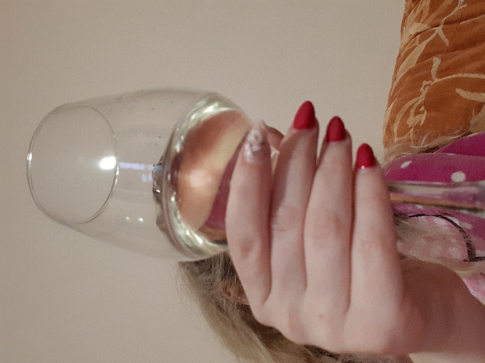 close-up, low-angle perspective of a person's right hand holding a clear stemware glass containing a light-colored liquid. The fingers are wrapped around the glass stem, with the fingernails manicured and painted solid red, except for the ring finger, which has a white patterned design. Partially visible on the left is blonde hair and a pink garment with white polka dots. On the lower right, a textured orange-brown fabric is present. The background is a plain, light-colored wall, and a distinct reflection of an artificial light source is visible in the glass and liquid. The scene is set indoors, in Jerusalem, Israel.