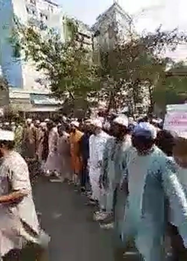 large group of people marching down a city street. Most of the people are men, and many are wearing white or light-colored clothing and hats. There are also a few people wearing other colors, such as red and blue. Some of the people are holding a banner or sign with text on it. The street is lined with buildings and trees. The sky is bright and sunny. The people are walking in a line, and the camera is following them. The audio indicates they are chanting something in what sounds like Bengali.
