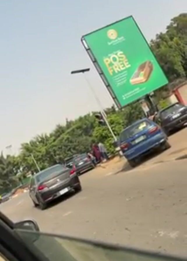street scene in what appears to be a city. Several cars are present on the road, with a grey Peugeot and a blue car visible in the foreground. A group of three people are standing near a parked grey car on the side of the road. The driver's side door is open. A large green billboard promoting "POS FREE" services for SunTrust Bank is visible overhead. The sky is bright and the trees are green, suggesting it is daytime. Traffic lights are also visible.