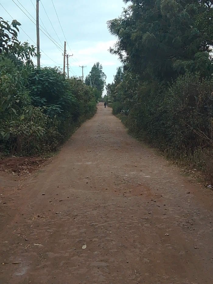 The image presents an unpaved dirt road in Ndeiya, Kenya, viewed from a low perspective, extending into the distance under an overcast sky