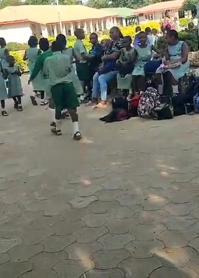 The video depicts a schoolyard scene during the daytime