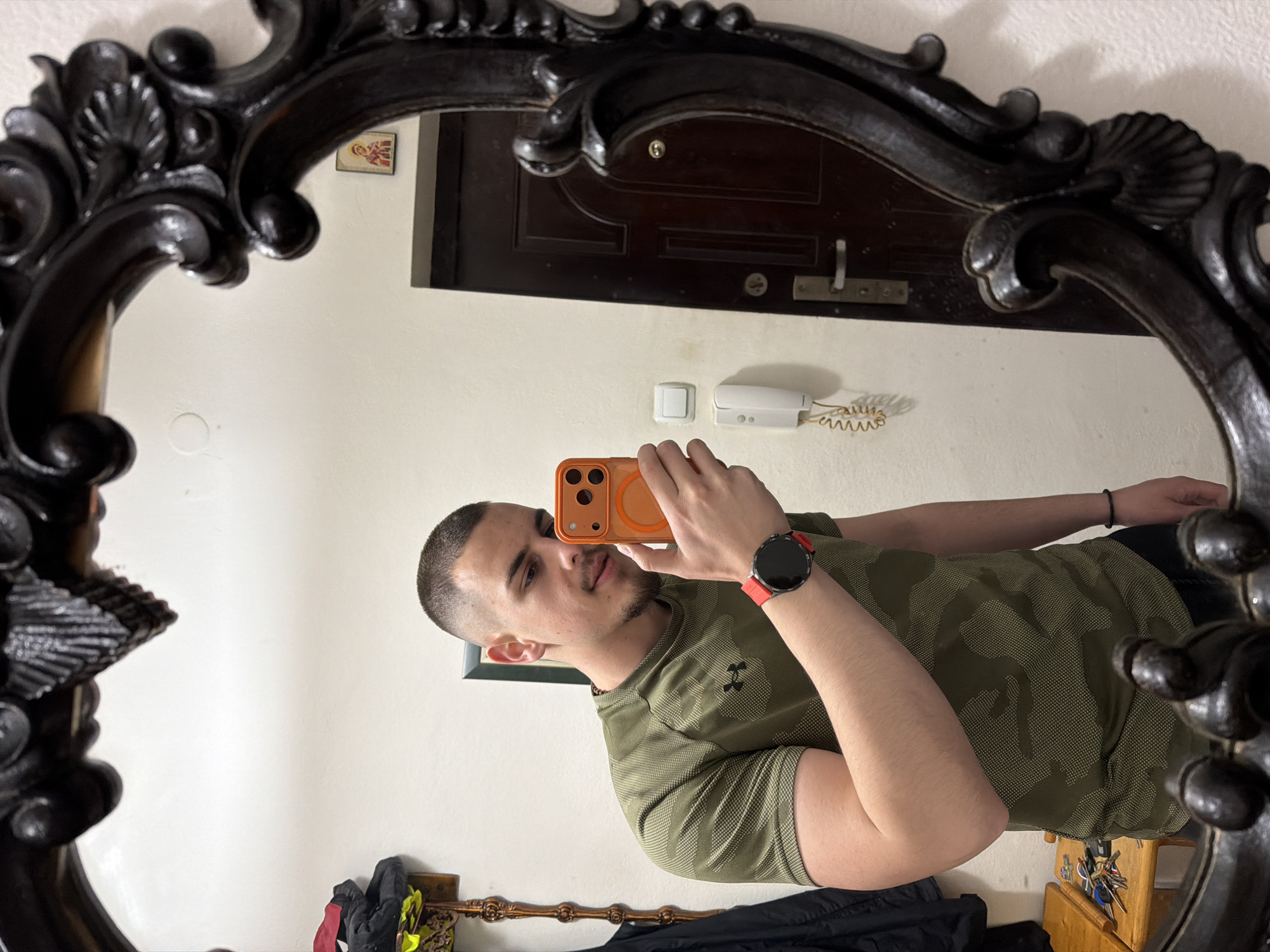 A man is taking a selfie in a mirror. The mirror is large and ornately framed in black. Reflected in the mirror is a doorway, a landline phone, a light switch, and a small framed picture. The man is wearing a green patterned t-shirt and a smartwatch. He is holding an orange-cased mobile phone. The setting appears to be indoors. The location is Peshtera, Bulgaria.