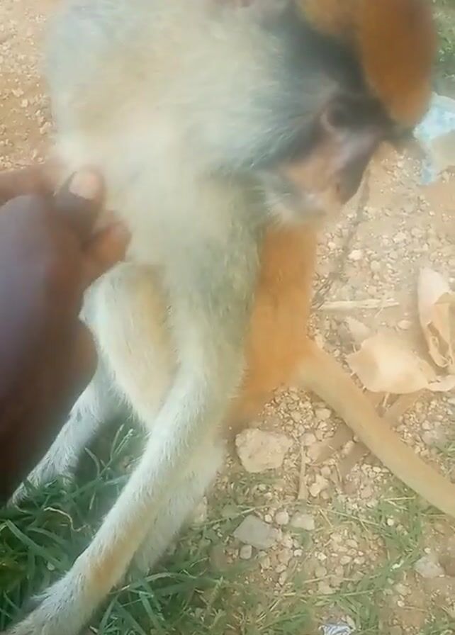 A tan and grey monkey sits on dirt and grass. A dark-skinned hand pets the monkey's fur. The monkey makes a distressed vocalization. The camera moves away from the monkey and becomes unfocused.