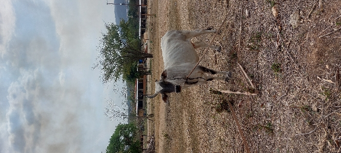 A horned cow, predominantly light gray, stands in a dry, grassy field. A rope is tied to its head. In the background are trees and buildings, possibly a farm or rural settlement. The sky is overcast with dark clouds. The ground is covered in dry vegetation and sparse grass, indicating a dry season or arid environment.