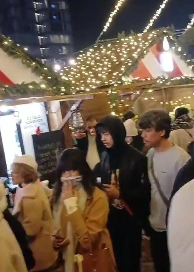 crowded outdoor market at night. Strings of lights illuminate the scene above wooden stalls with red and white awnings. People of various ages and ethnicities stroll through the market, some holding beverages. Most are wearing winter coats and hats. A tall building is visible in the background. The atmosphere appears lively and festive.