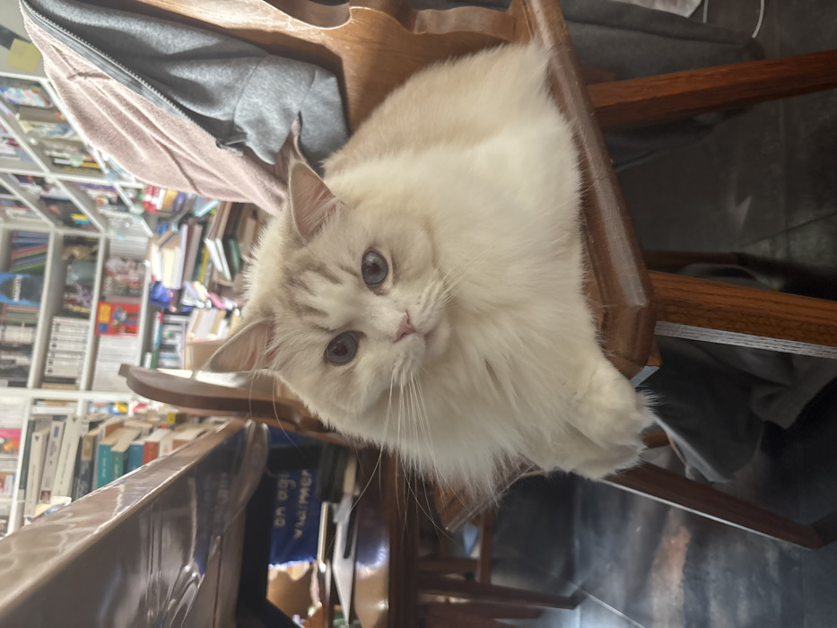 - "A fluffy, light cream-colored cat with blue eyes and faint tabby markings on its face sits upright on a wooden chair" by FM-gdBDp1, licensed under CC BY 4.0