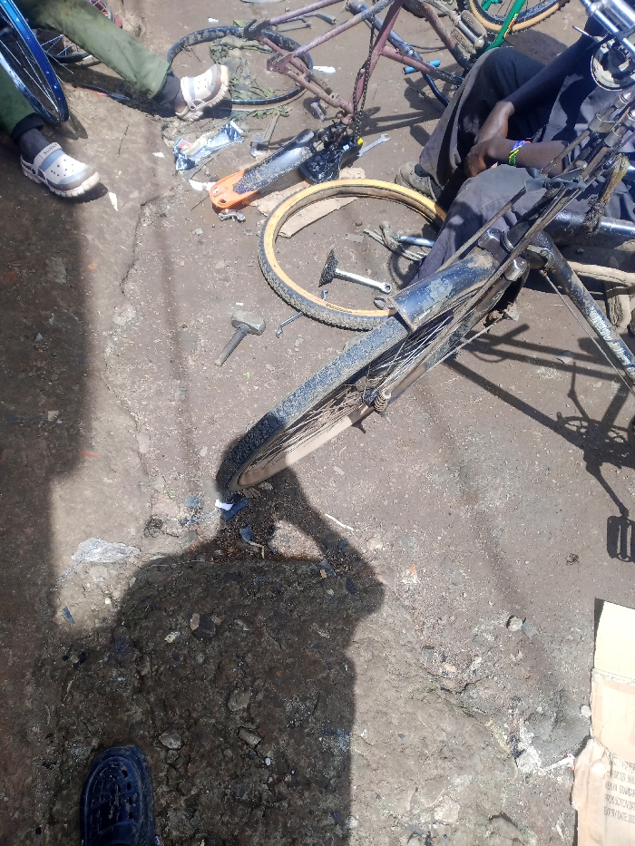 A bicycle repair scene shows multiple disassembled bicycles scattered on the ground