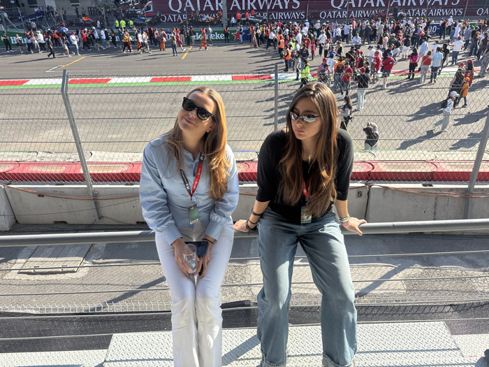 The image depicts an outdoor, daytime scene at the Autódromo Hermanos Rodríguez in Mexico City, Mexico. In the foreground, two young adult females are positioned on an elevated metal viewing platform, leaning on a horizontal metal railing. The female on the left wears a light blue long-sleeved shirt, white pants, and dark sunglasses, holding a clear glass and a dark smartphone. She also wears a red lanyard with a credential. The female on the right wears a black long-sleeved top, light blue wide-leg jeans, and silver-framed sunglasses, with a black lanyard and credential visible. Behind them, a chain-link fence and concrete barriers with red and white markings separate the viewing area from the track. In the background, a large crowd of individuals, comprising both spectators and event staff, is present on the asphalt track surface and surrounding areas. Prominently displayed along the track edge are large red and white banners featuring the "QATAR AIRWAYS" logo. The scene is brightly lit by sunlight, casting distinct shadows.