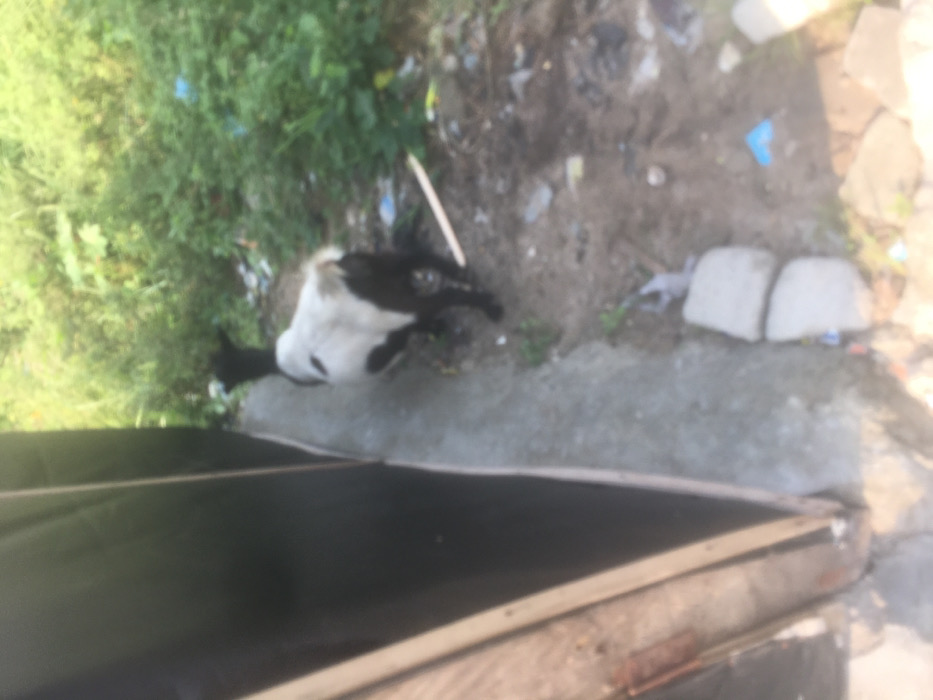 The scene depicts an outdoor environment in Abagbo, Nigeria. A bicolored goat, predominantly black on its head, neck, and hindquarters, with a white midsection, is positioned in the center-right, walking towards the right and slightly away from the camera. Its head is turned marginally to the left. To the immediate left, a dark, vertical structure, likely a metallic or plastic panel, is visible, bordered by a lighter-colored, vertical trim. This structure runs alongside a grey concrete curb or raised pathway that extends across the lower-left portion of the frame. The ground is composed of light brown dirt, scattered with various debris, including white, blue, and brown plastic fragments, and a light-colored wooden stick situated to the right of the goat. Dense green foliage and weeds are prominent in the background and along the right side of the frame, indicating an overgrown area. Two light-colored, rectangular blocks are partially visible on the ground near the concrete curb in the lower-middle. The scene is illuminated by natural daylight. No human subjects are present.
